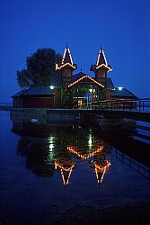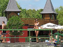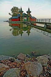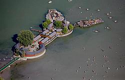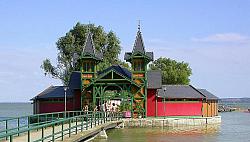 Az első vízre épített fürdőház 1864-ben készült. Az első kerek fürdőszigetet az 1880-as években építették, amit 1893-ban díszes bejárattal két szigetből álló fürdővé bővítettek. Felújítás helyett 1960-ban fém- és betonelemekből új szigetfürdőt építettek. Az elmúlt években, több ütemben az eredeti faszerkezetet állították helyre.